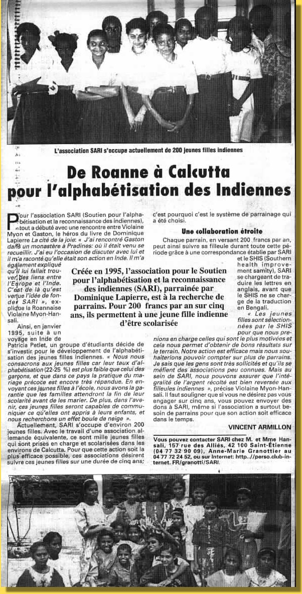 28 Mars 1999 : SARI a été choisi par les jeunes des Aumôneries de l’enseignement public (Lycée – Post-bac) pour les accompagner dans l’opération « Solidère-toi » à Lyon. Nous avons présenté un diaporame, participé à une table de presse, à un point rencontre et débat avec les jeunes.